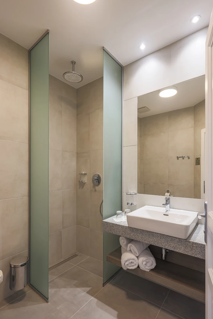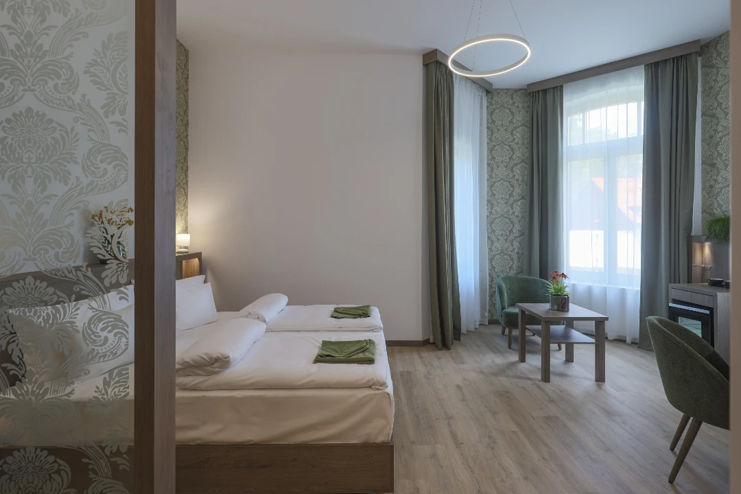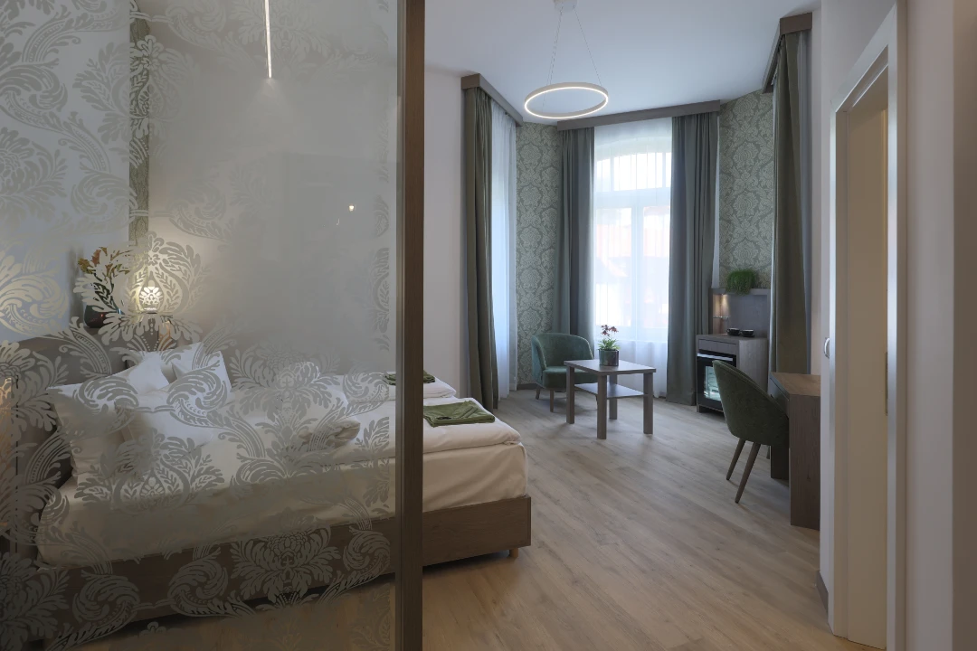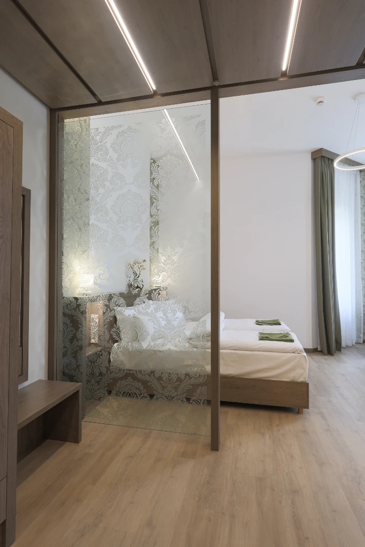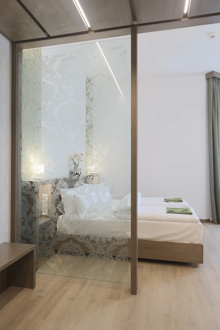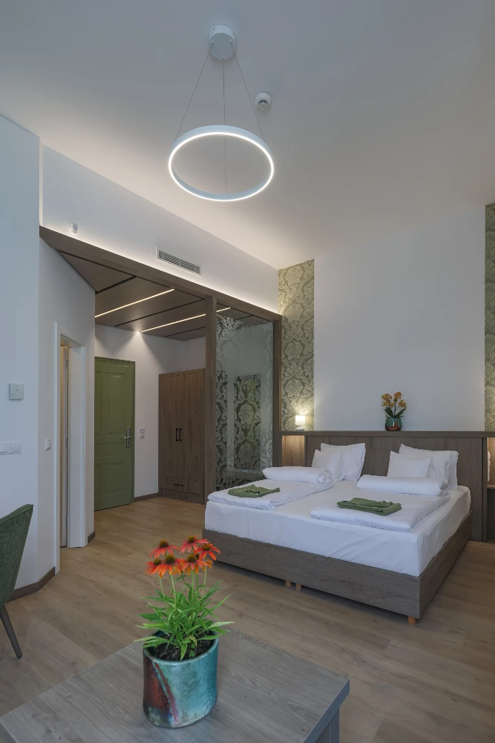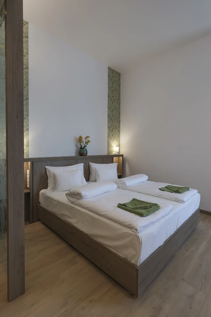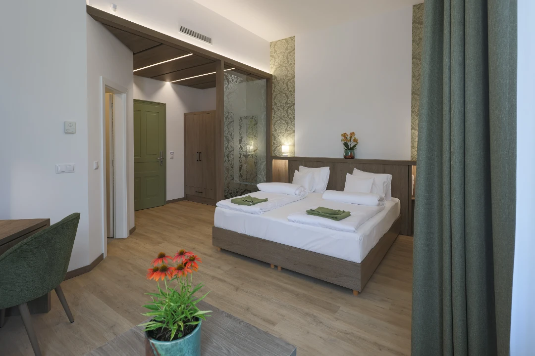 A különleges formájú, elegánsan berendezett, tágas, 30 m2-es szoba, amely hálóból (180 cm széles franciaággyal), egy térben lévő nappaliból, előtérből és zuhanyzós fürdőszobából áll, a legnagyobb kényelmet biztosítja 2 felnőtt és legfeljebb két 4 év alatti gyermek (babaágy elhelyezésével) számára.